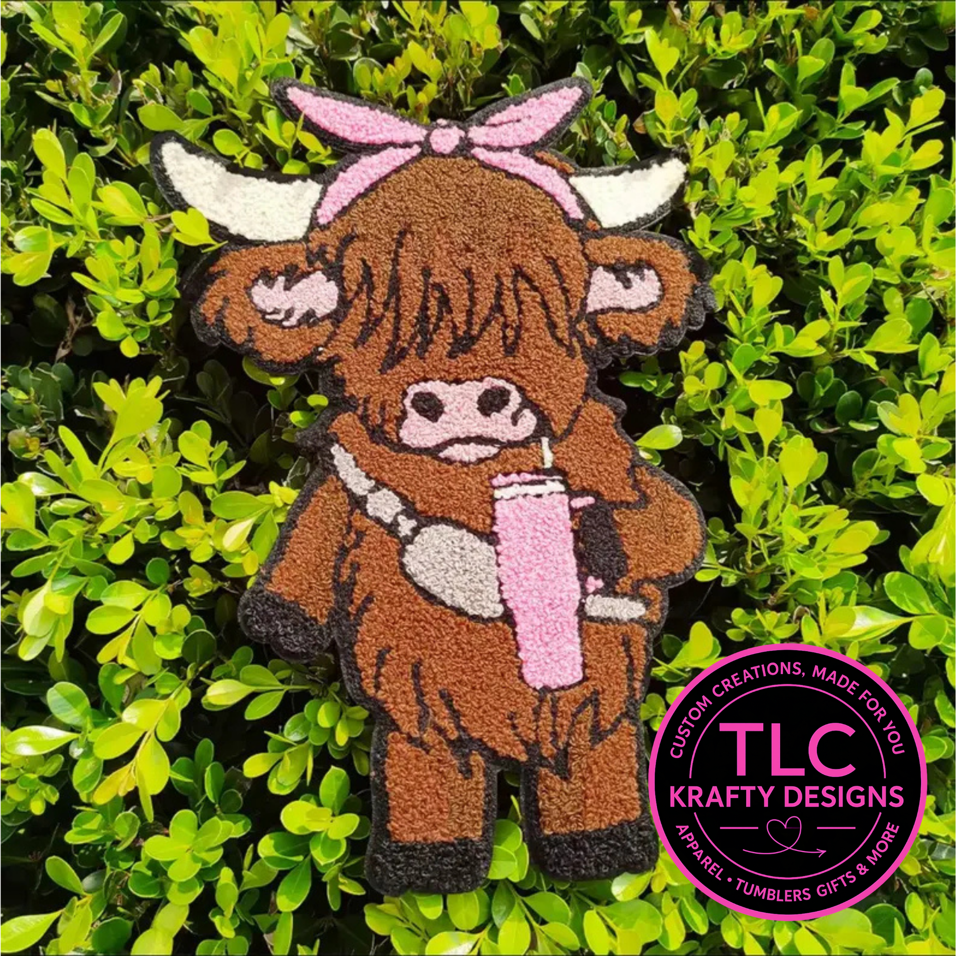 This charming chenille-style patch features an adorable fluffy cow holding a pink tumbler and wearing a matching pink bandana — perfect for adding personality and fun to your customized apparel and handmade gifts.
