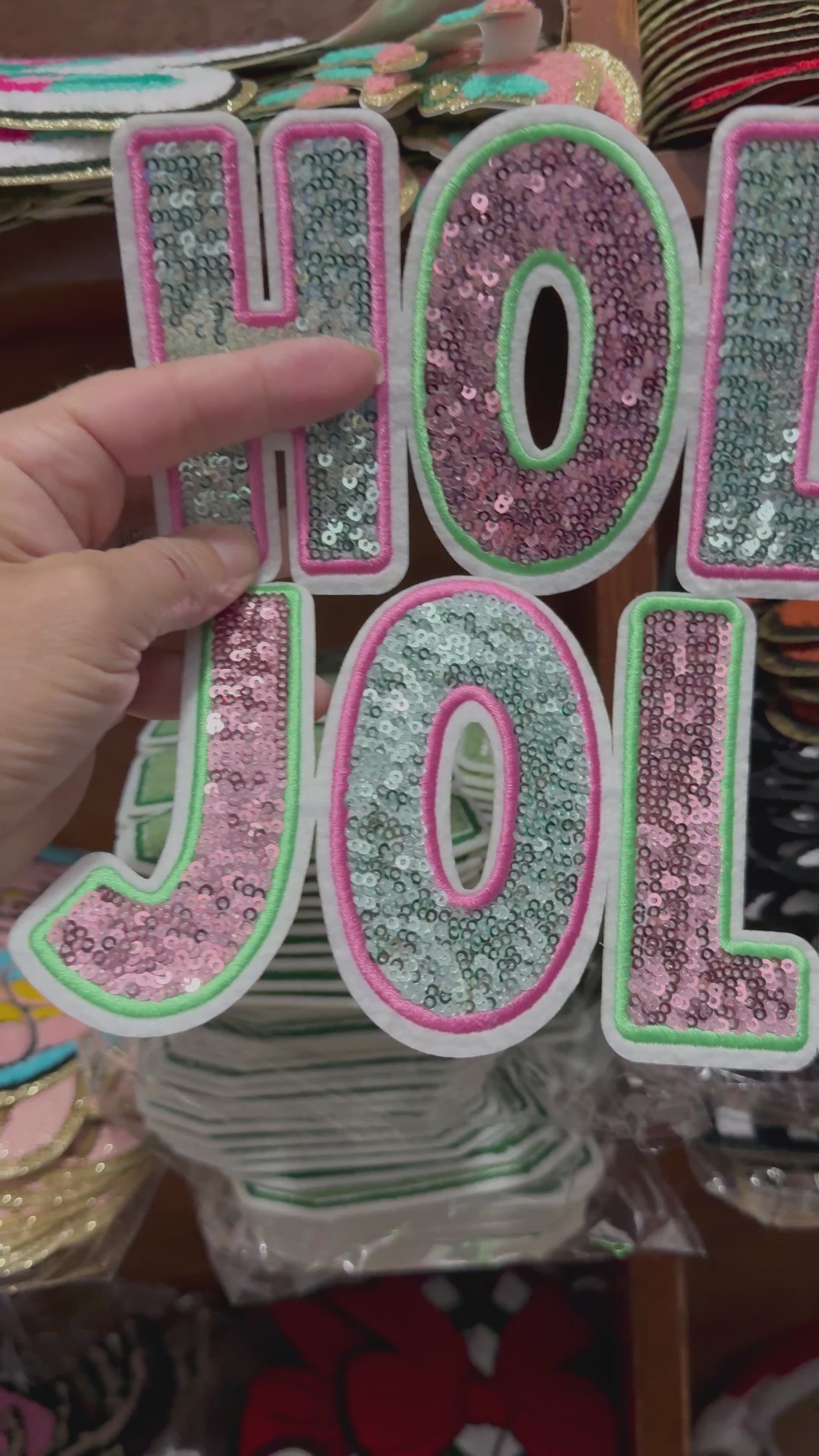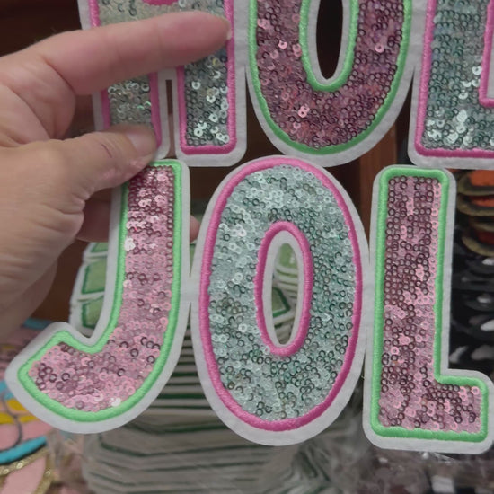 XL Holly Jolly Sequin Patch – Sparkly Christmas Appliqué in Pink, Aqua & Green