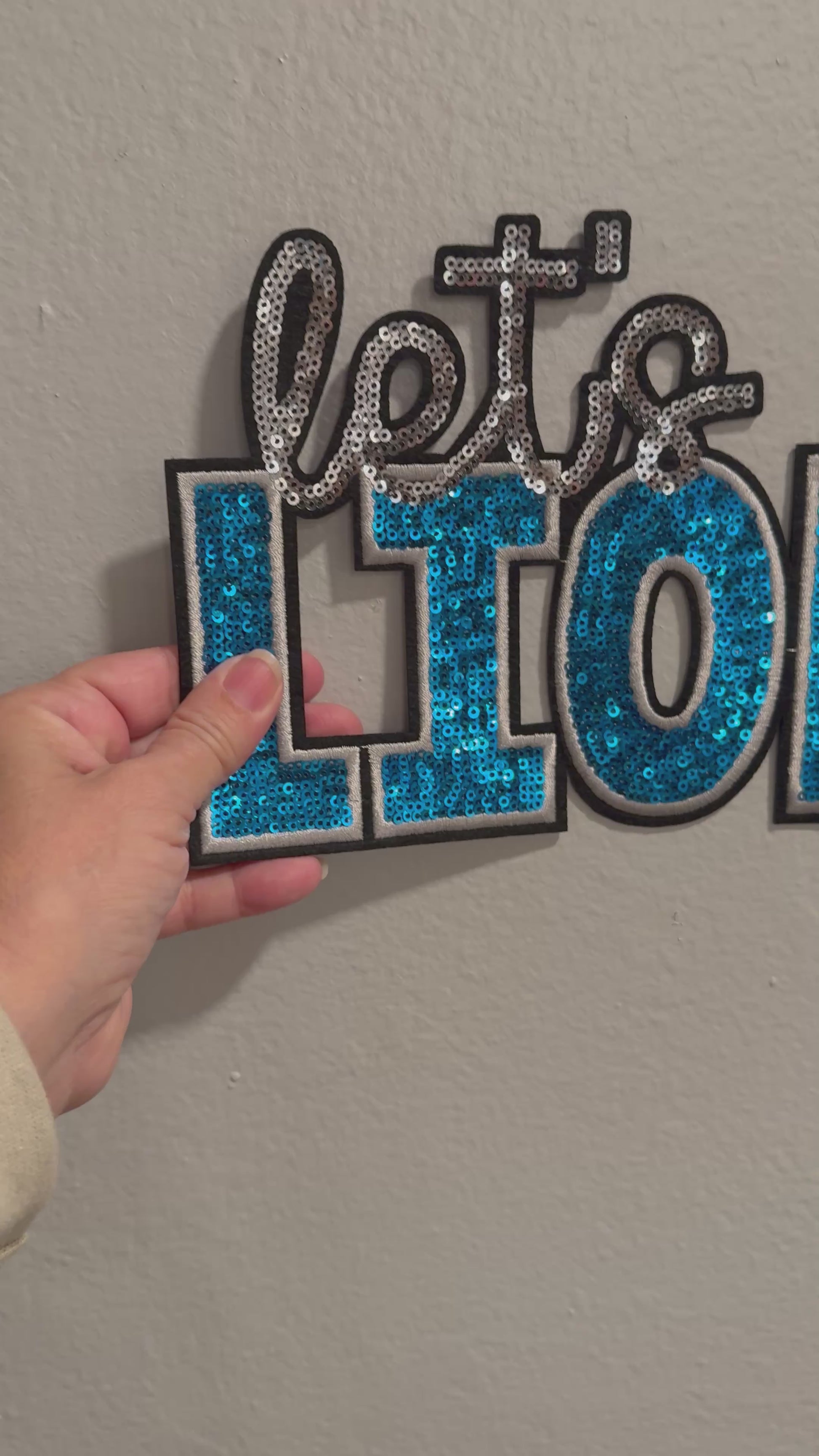 • Silver sequin script “Let's go”