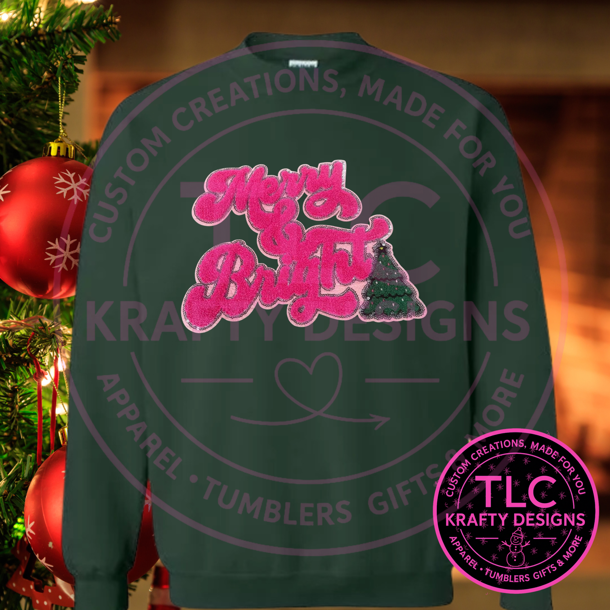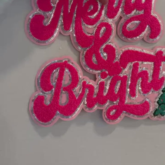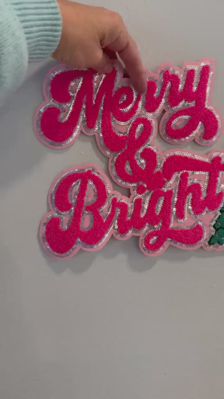 Add a pop of holiday glam to your favorite sweatshirt or tote with this bold “Merry & Bright” chenille patch! Featuring bright pink chenille lettering outlined in sparkling sequins and a festive embroidered Christmas tree, this patch brings cheerful holiday vibes to any outfit or project.