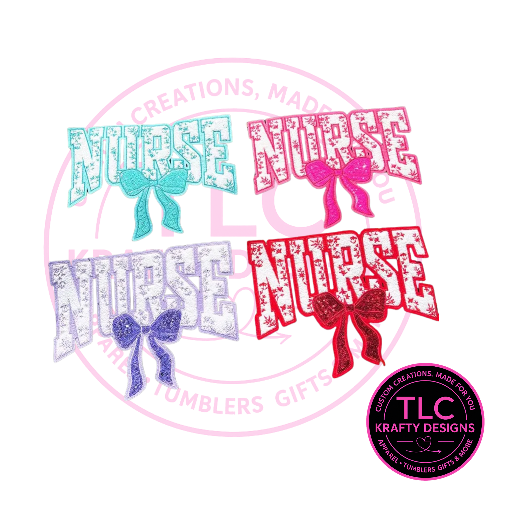 Show off your sparkle and pride with this XL NURSE chenille patch — a bold, eye-catching design perfect for custom sweatshirts, jackets, tote bags, or scrubs! Each patch features soft chenille letters paired with a glittery sequin bow that adds just the right amount of shine.