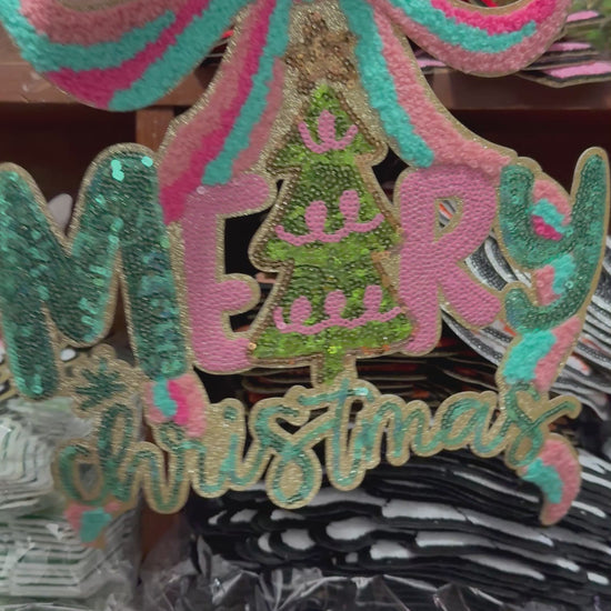 XL Pastel Merry Christmas Chenille Patch with Tree & Bow – Sequin Iron-On / Sew-On Appliqué