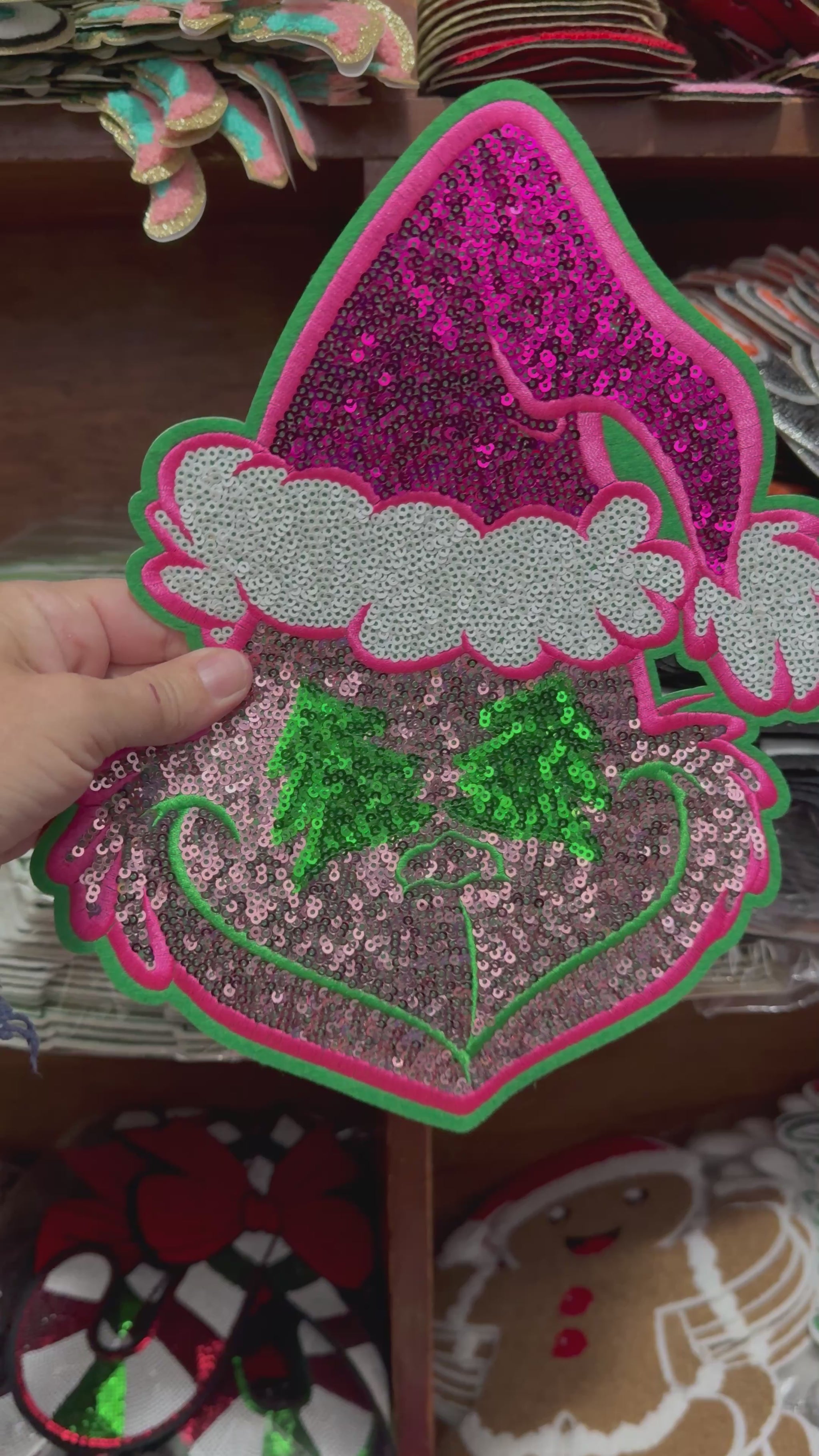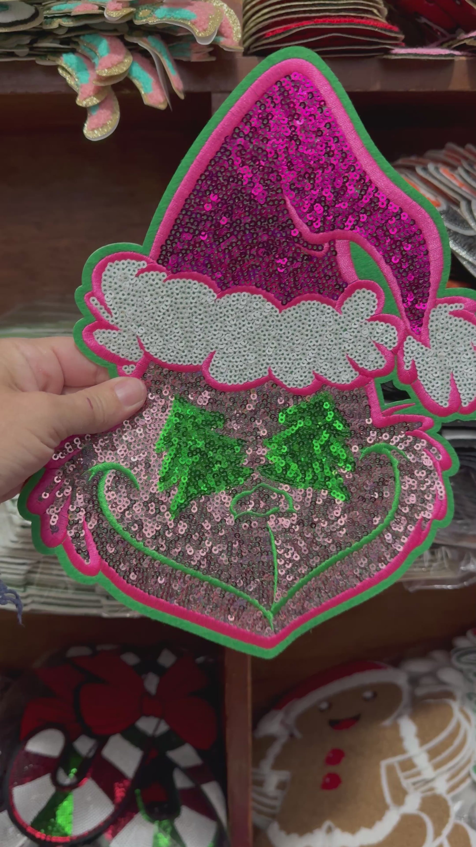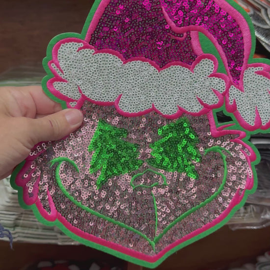 Bring some mischievous sparkle to the holidays with this bold XL chenille patch! Featuring a glittering Grinch face with green sequin Christmas tree glasses and a hot-pink Santa hat, this patch is the perfect mix of naughty and festive.
