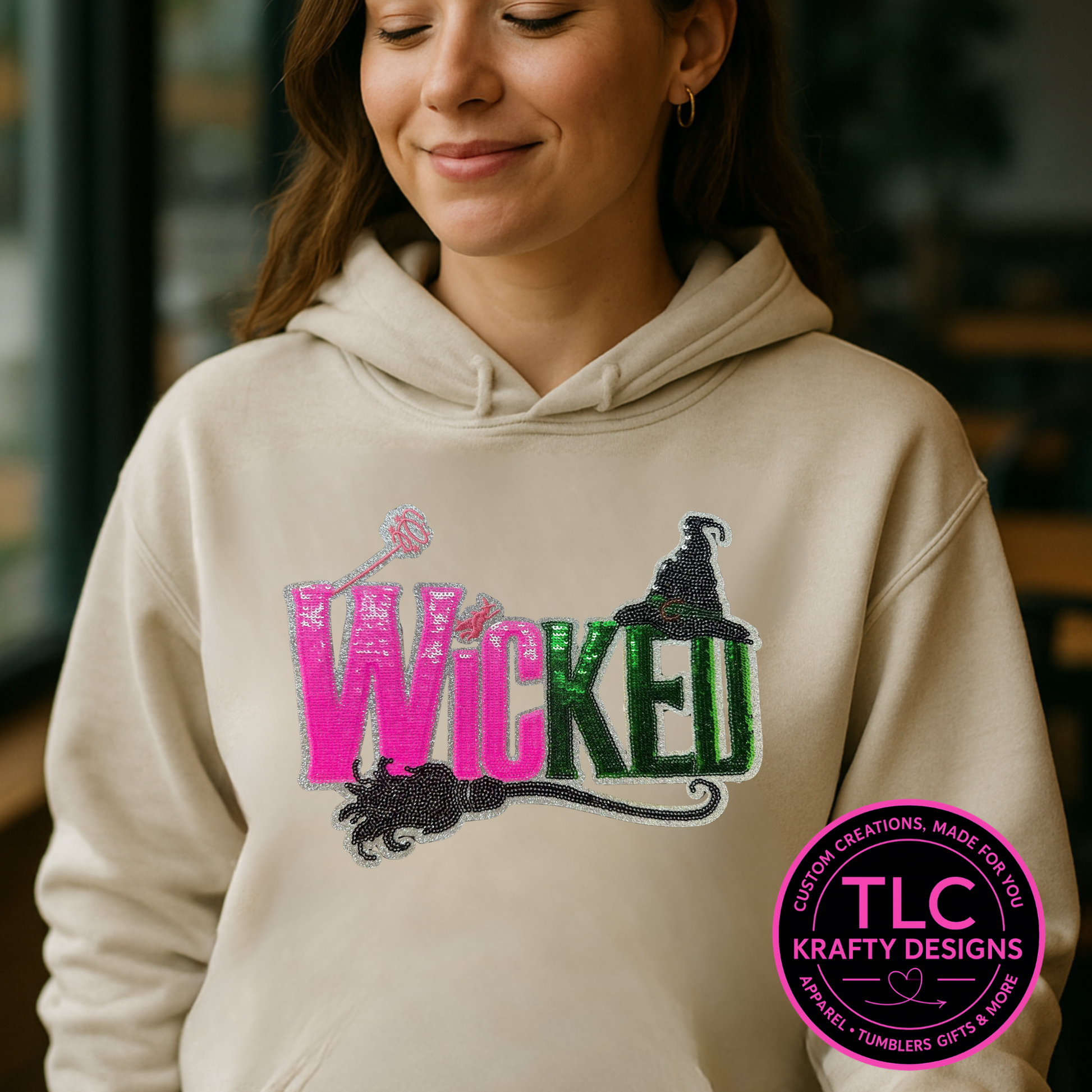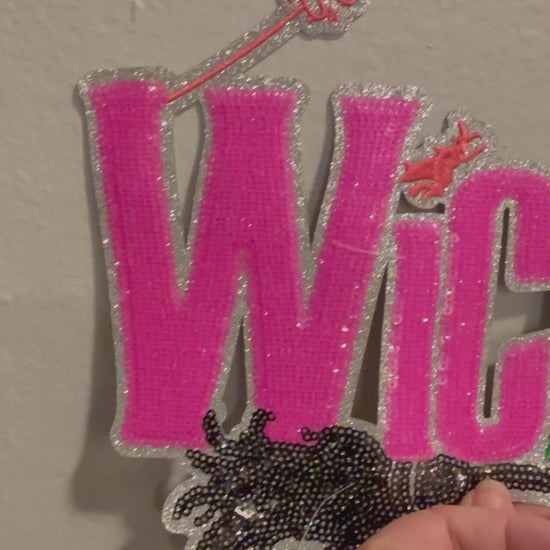 Turn your sweatshirt or hoodie into a statement piece with this bold WICKED sequin patch! Featuring hot pink and emerald green sequin lettering, a witch hat, broom, and wand details — this patch sparkles from every angle.
